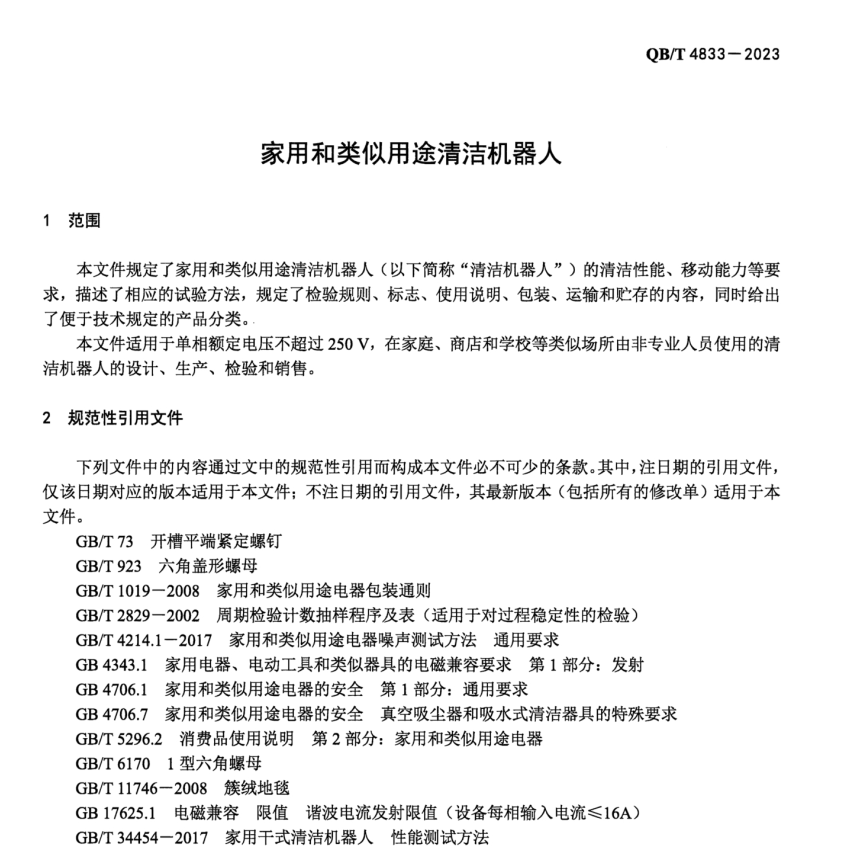 qb_t 4833-2023 家用和类似用途清洁机器人